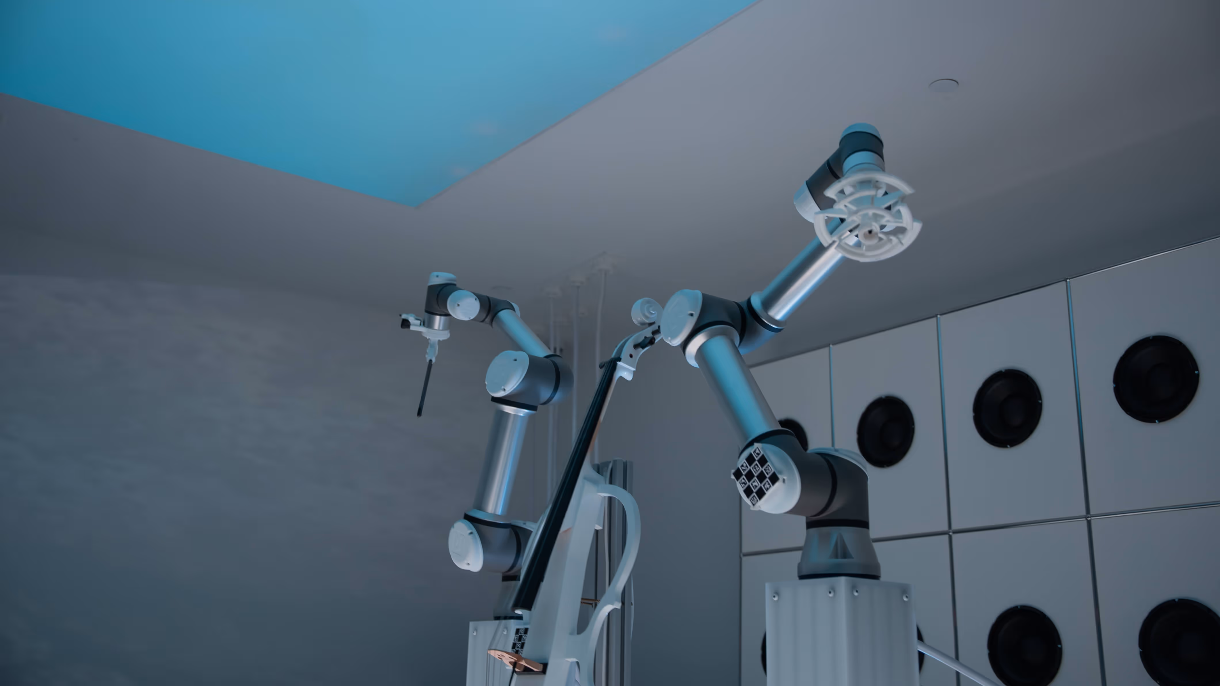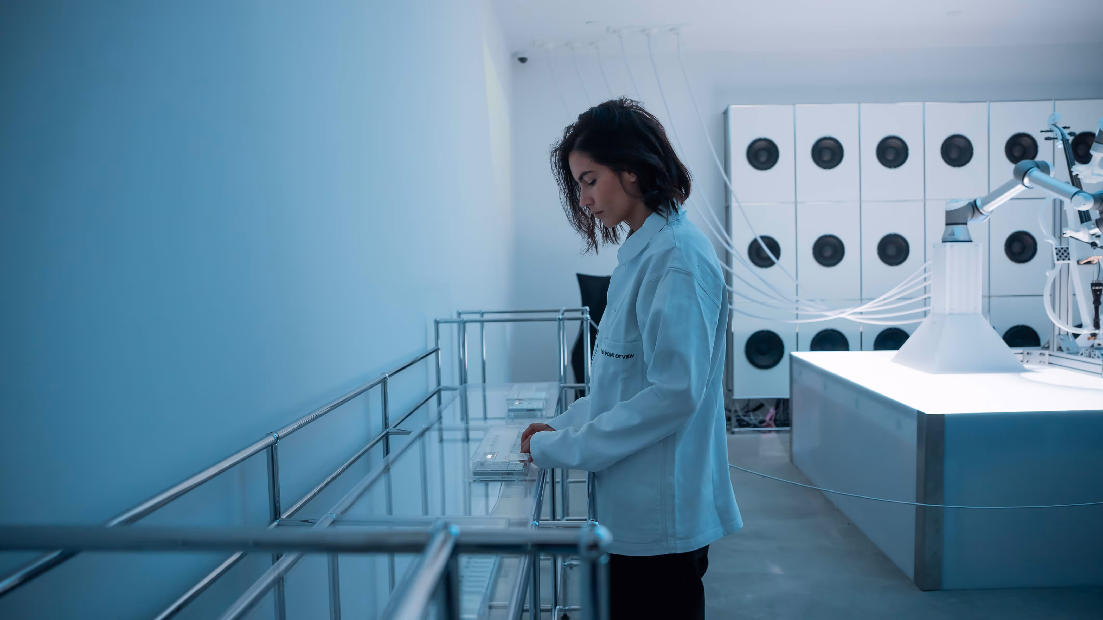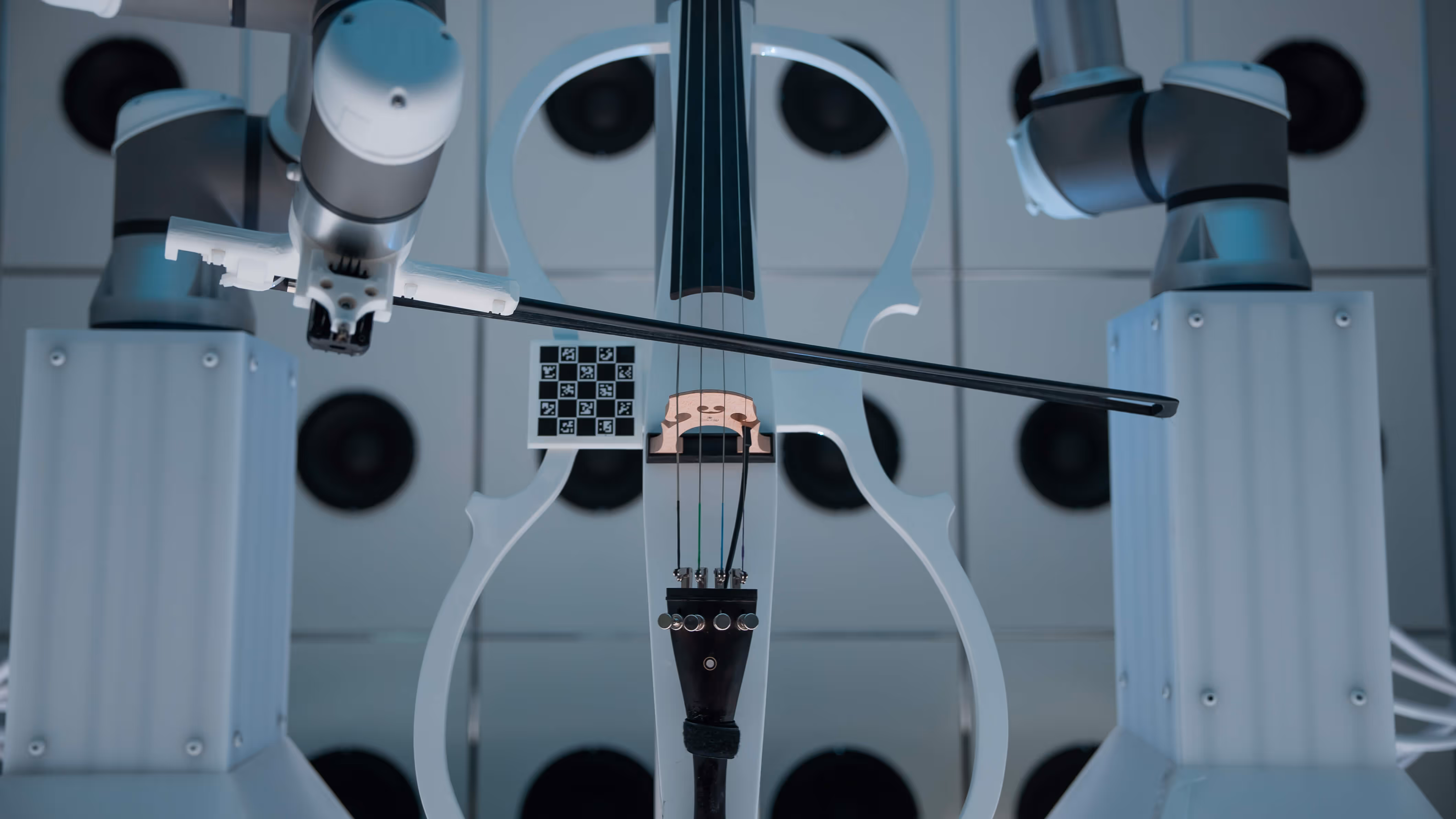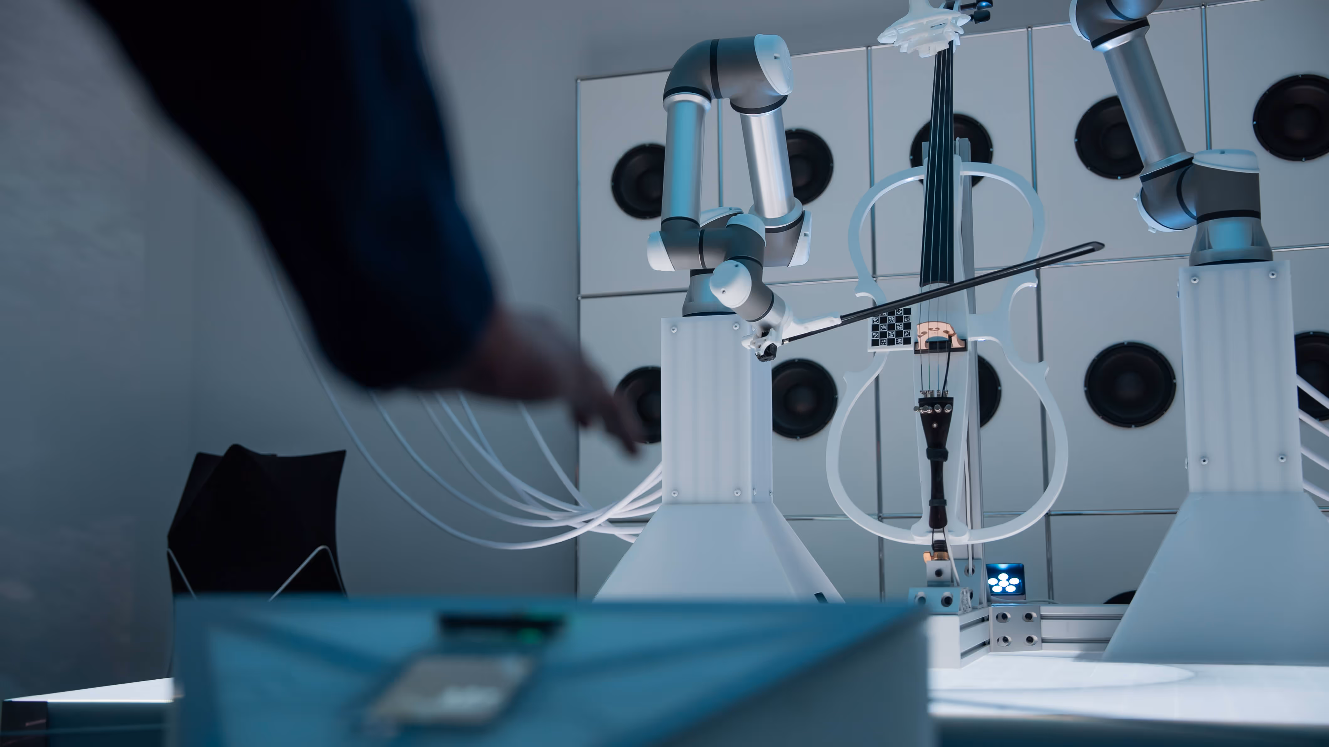 Robotic arms, poised at the center, move with precision, their movements orchestrating the creation of a live, evolving melody. Four OP-1 synthesizers are strategically placed, allowing guests to remix and layer the sound, creating a symbiotic relationship between technology and human interaction. The screens pulse with audio-reactive visuals, amplifying the music’s organic flow. An evolving composition that emerges in real time as robotic arms play an electric cello. The sound is fluid, constantly shifting and adapting to the guests’ making the audience active participants in the creation of the work. The interplay of sound, motion, and visual stimuli fosters an environment where the boundaries between creator, instrument, and audience dissolve, offering a dynamic exploration of artistic freedom.