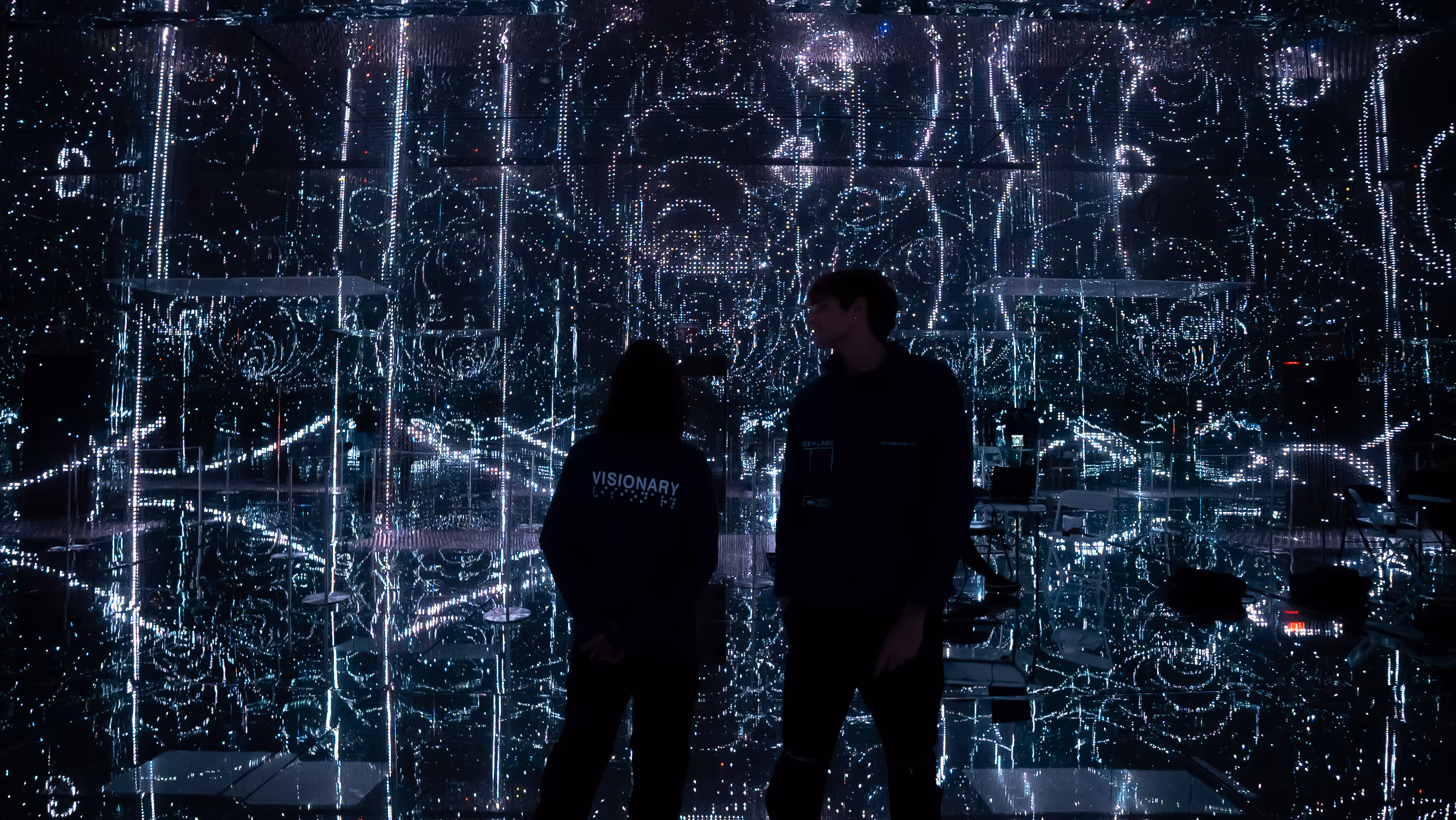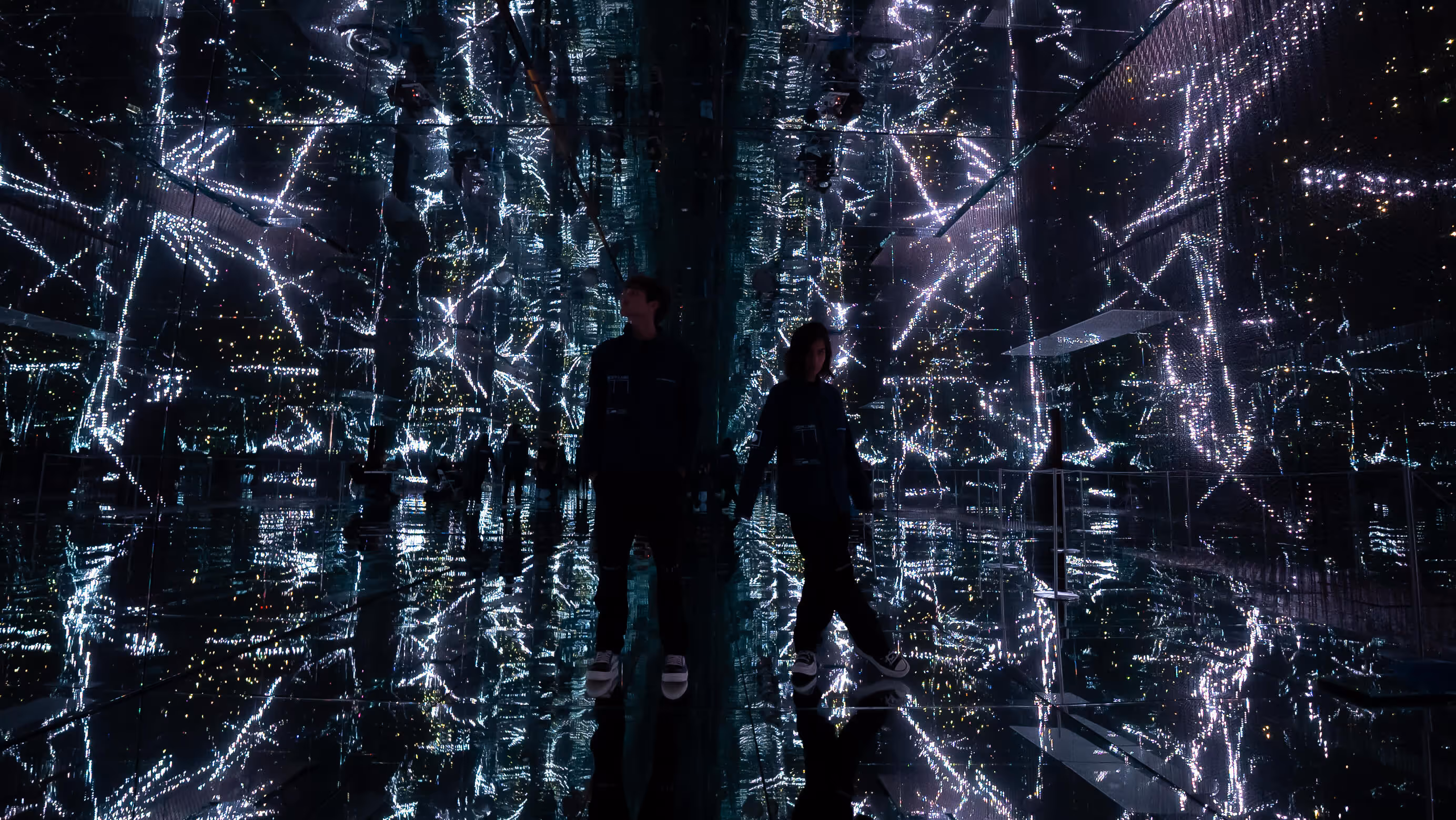 Volumetric lighting allows visitors to see voxels (volumetric pixels) of light in space. The light source is modeled as a transparent object in a container of volume. The resulting effect is of passing through a hologram. The use of mirrors and advanced technology, unlock the power of three-dimensional visualization to create a cascade of luminescent particles that appear suspended in infinite space.
