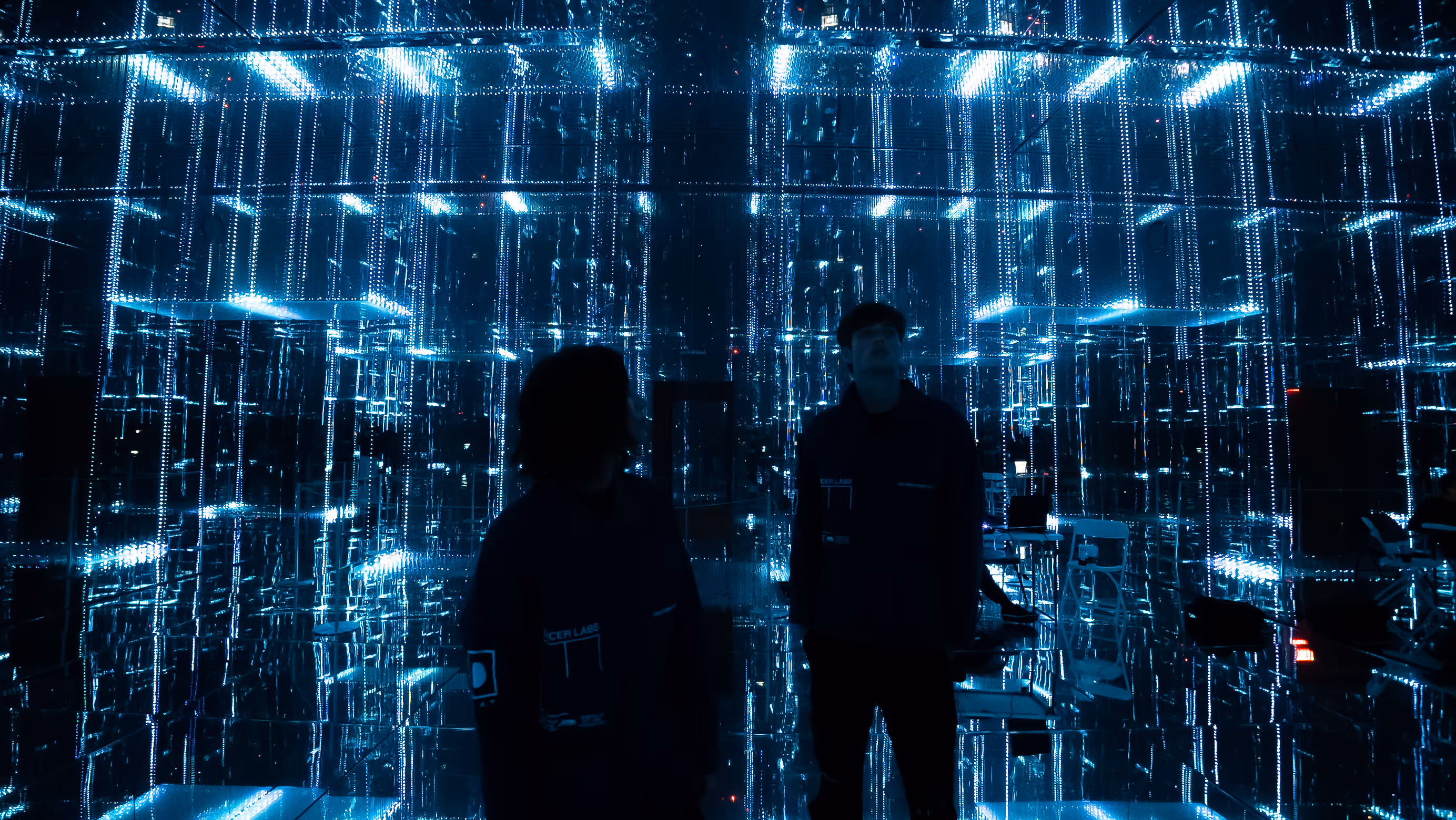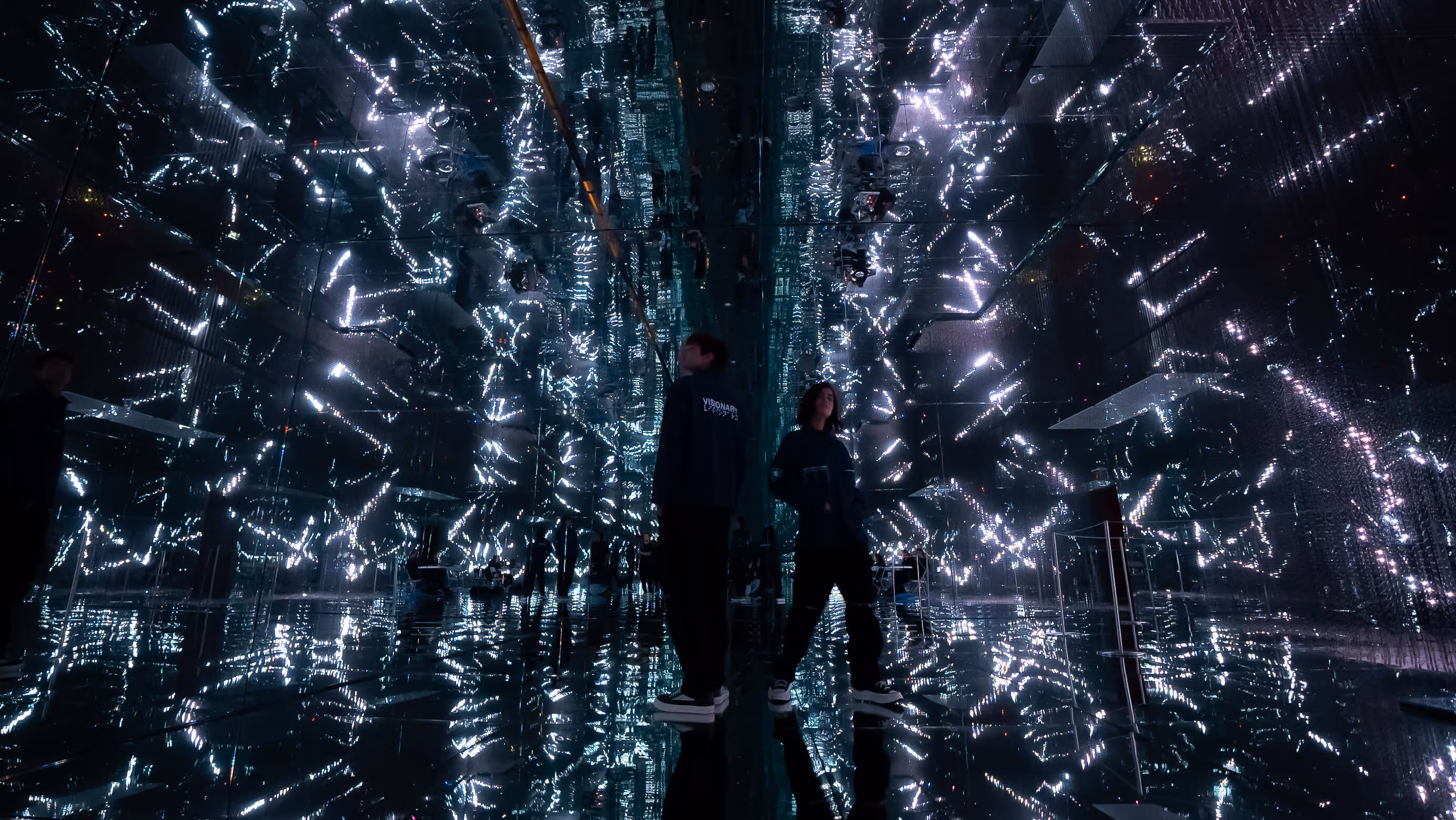 The volumetric light installation reimagines painting as pure sensation. Historic motifs dissolve into fields of luminous particles, shifting and reforming in continuous motion. Fragments of form emerge, fracture, and recede, multiplied infinitely by mirrored walls. The work conjures a dreamlike space where light becomes material and the image exists only in flux.