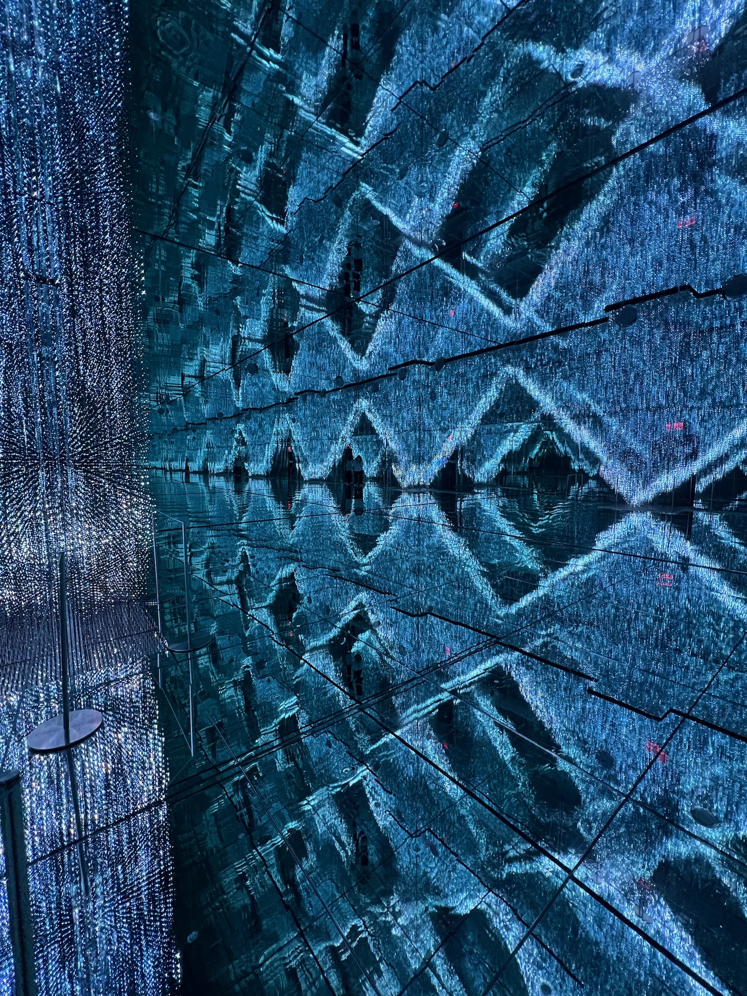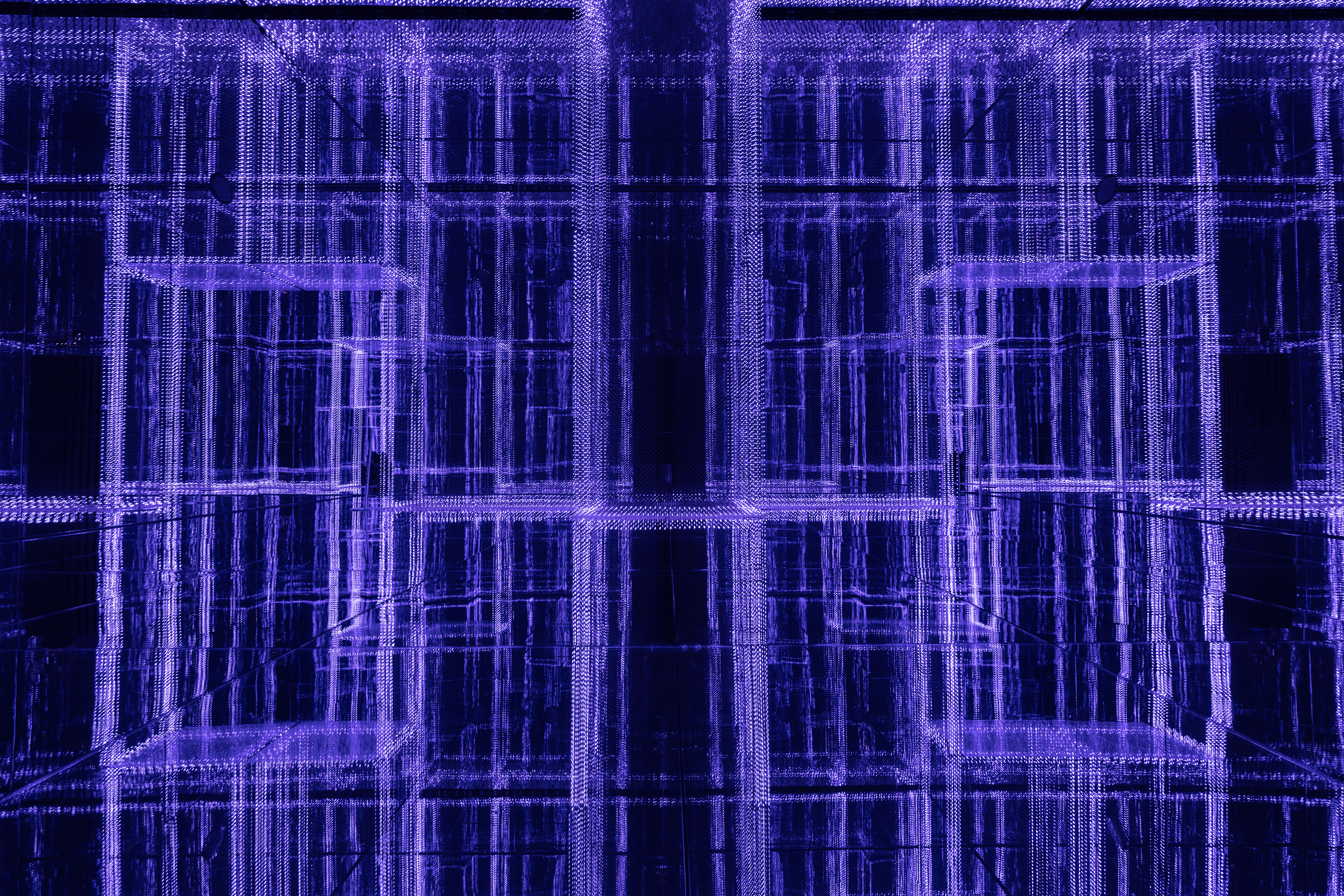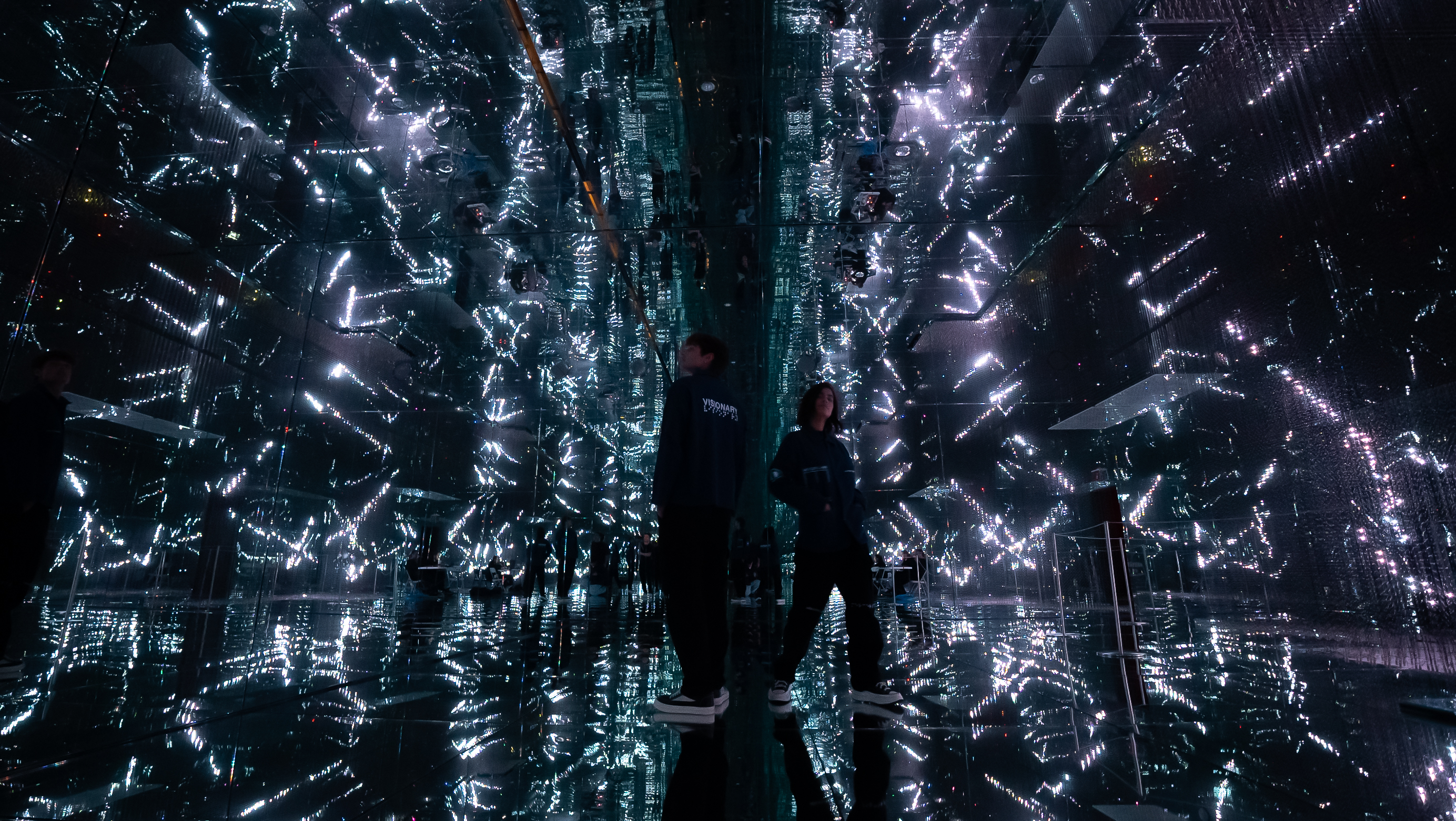 Volumetric lighting allows visitors to see voxels (volumetric pixels) of light in space. The light source is modeled as a transparent object in a container of volume. The resulting effect is of passing through a hologram. The use of mirrors and advanced technology, unlock the power of three-dimensional visualization to create a cascade of luminescent particles that appear suspended in infinite space.